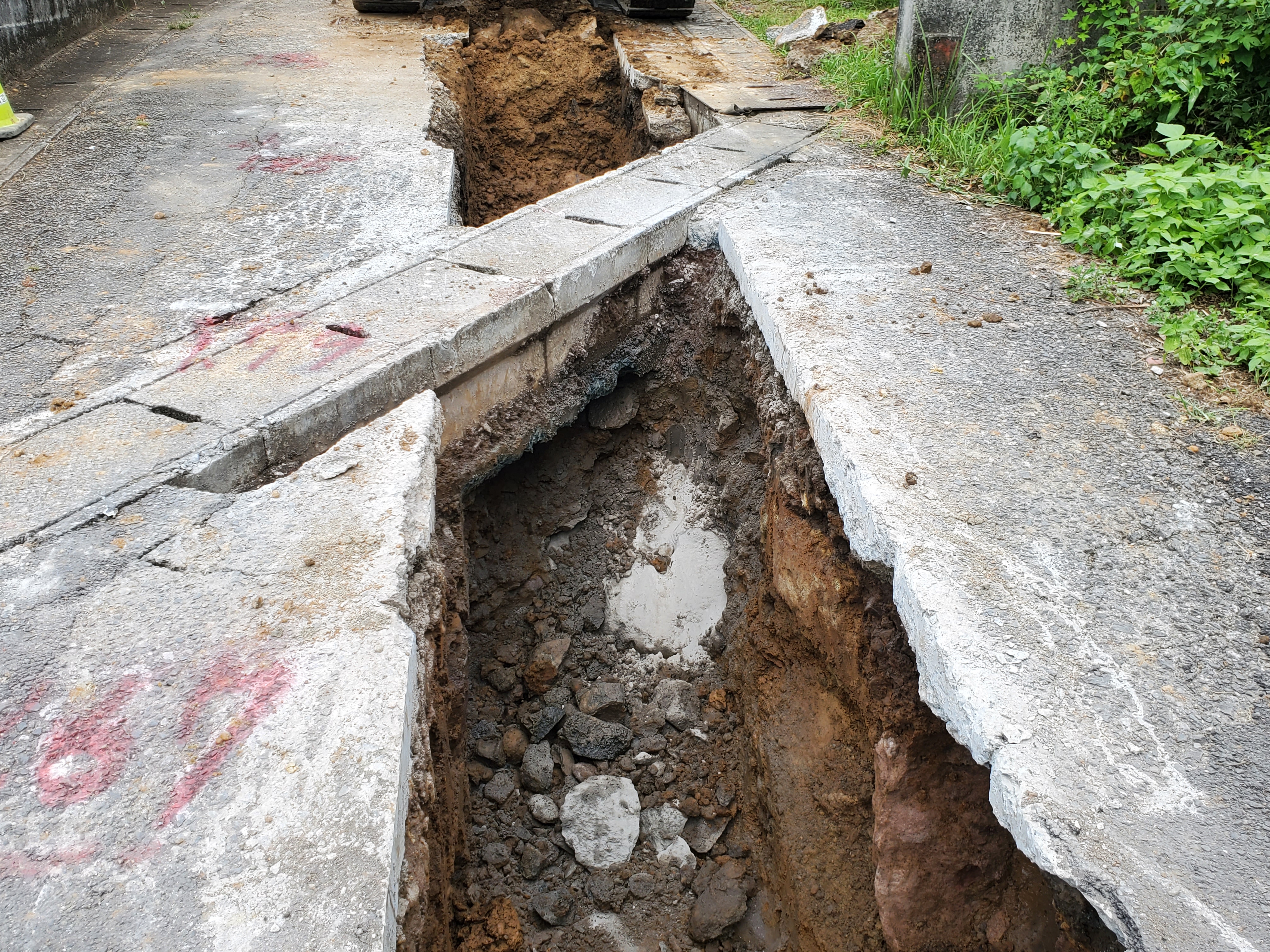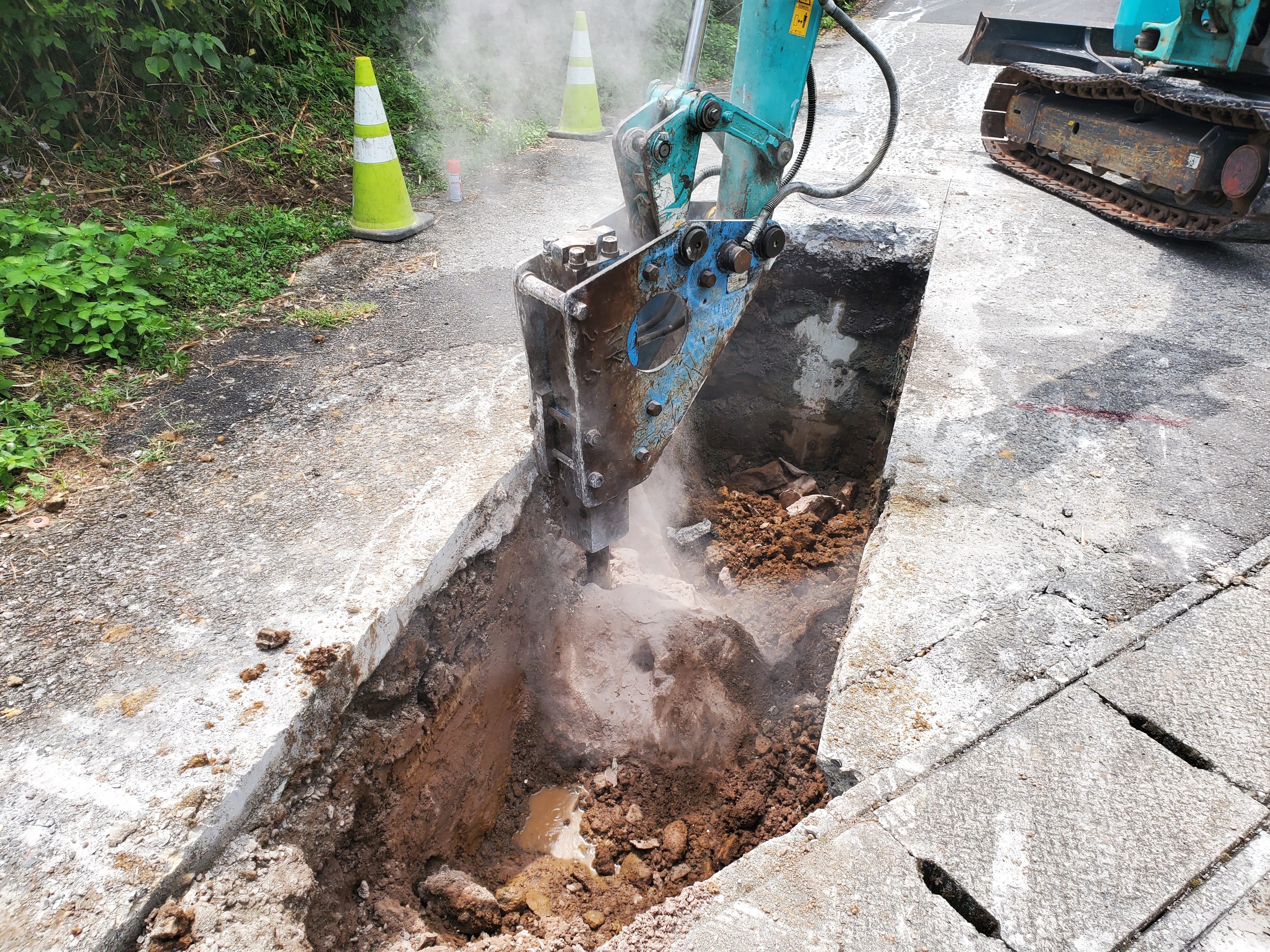 今日から予定通り、宗行下水現場に着工しました。朝8:30から車両通行止めの規制をかけて、カッター切断作業(九建施設さん)にかかりました。ここまではまぁ順調に作業は進みました。!(^^)!次に本日施工分(14m)の舗装版を撤去しダンプに積込、日出エコセンターさんに搬出それからが問題が続々と発生しました。まず、既設マンホールが直壁(管取付壁)の高さが足らず流入の削孔が出来ない(可とう継手が斜壁にかかる為)何故に?斜壁にH600を使っていましたが、H450か300にして直壁を高くすれば良いのに?既設マンホールはいつ施工したのかも、どこがしたのかも判らないという事でしたので、どうしようもなく・・・日出町の監督員の方と現地で打合せを行い、計画管底を下げ、上流側新設マンホールの直壁を+300することで勾配は変えずに行こうという事になりました。新設マンホールは既に手配しており、削孔していたら新しく直壁を頼まなければならなくなるので急いで製造メーカー担当者にTELして何とか間に合いました。が掘削深さが+300となったことで、土留不要区間にも設置しなくてはならなくなり、掘削量も増えます。まあ致し方ありません。良くあることです。が今度は本当の大問題発生です!掘削していた所、『大きな転石が・・・』バックホウ0.3m3でもピクリともしません。『何で・・・ここは豊岡じゃないはず・・・川崎です・・・川崎はこんな大きな転石は出らんはずやろ?』川崎でも小深江で下水を施工した際は、全くこぶし位の石しか出なかったのにこんなに違うとは・・・急いでNKリースさんにTELして0.2のブレーカーを持ってきてもらい、バカバカ打つけど中々割れません。が三代目が粘り強く打ち続ける事1時間やっと割れました。『とりあえず良かった』私は転石を飛ばして上流側の床掘をしていましたが・・・またまた転石・・・しかも既設横断側溝の真下に出ました。しかも今度は地石みたいでブレーカーのノミが火を噴きそうでした。割れませんここで本日の作業は終了です。明日『俺がどうにかして割るわ!』と皆に言ってバリケードをして終業となりました。『あぁー、あしたどうするかな?最悪の場合セリヤかけるか?削孔して何年か前の購入したブラスターかけて観るか?』と考えながらこの記事を打ち込んでいます。転石を早く割って、明日は予定の『配管3本』いけるでしょうか?1スパンでこんなに問題が発生するとは・・・先が思いやられますが、みんなで力を併せて『頑張って行きましょう!』