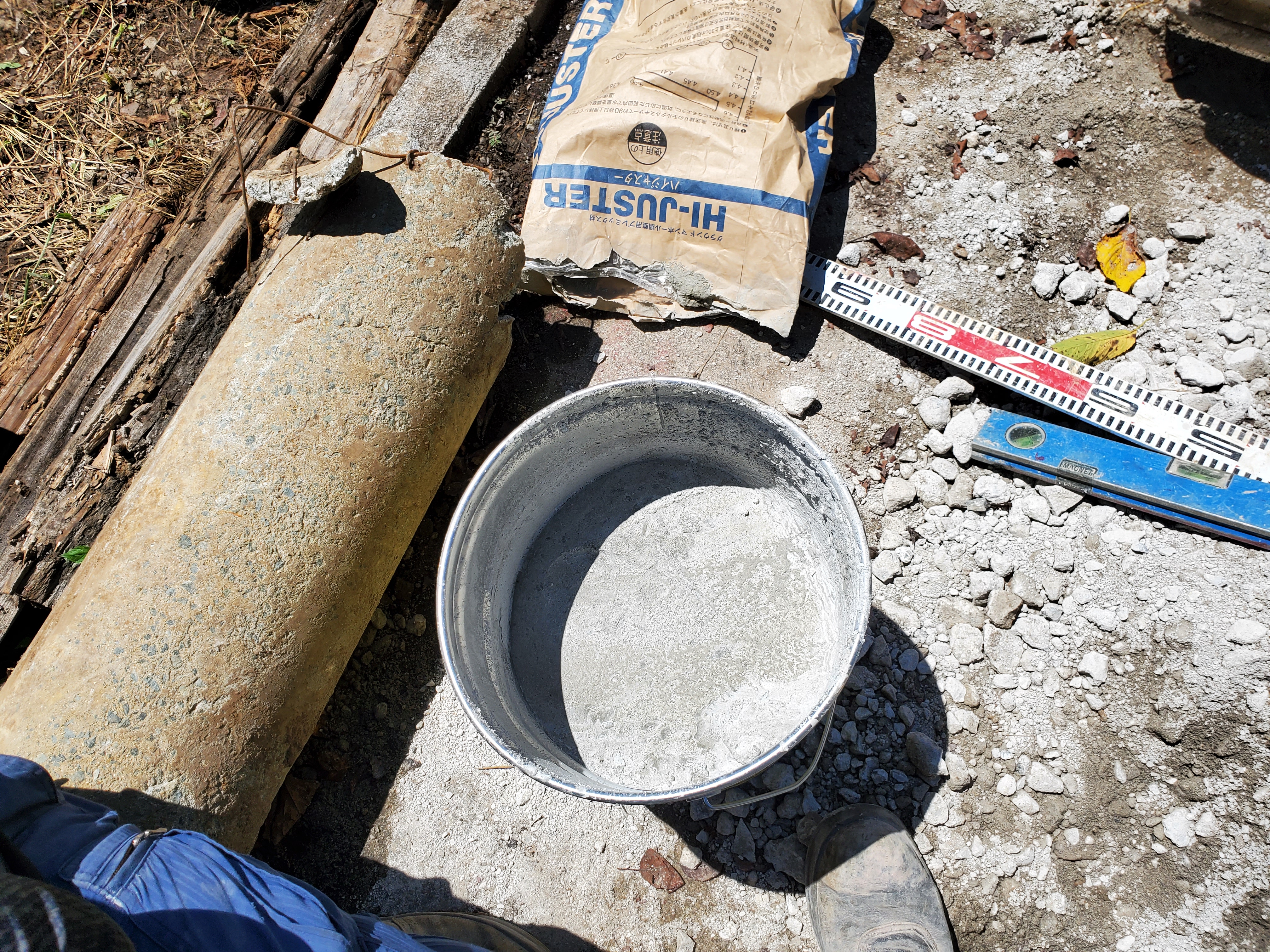 それから終点側からマンホールの高さ調整(AJホルダー、ハイジャスター)を始めました。一発目で、少し注入した後、 いきなり・・・写真の様にペール管の中でハイジャスターが固まってしまいました(笑)『おまえ達、12.5kgの水量じゃったんじゃねえんか!』と言うと『25kgんとこじゃった』と返答が・・・じゃあ何故?そんなに時間を掛けたわけでもないし、『一同なんで???』どうしようもないので『新しいペール缶&ハイジャスター』を会社に取りに帰って再度、練って注入しました。(彼らの急ぎっぷりがちょっと可笑しかったです)その後は問題なく・・・と思いきや、最後の1箇所で3代目痛恨の『アンカーボルトをバケットで曲げる』ミスをしてしまい・・・またまた時間をロスしてしまい・・・結局3箇所の高さ調整が終わったのが16時でした。それから少しでも『舗装版撤去』をしなければと、作業に掛かりましたが、境界?の建築ブロックが舗装版もろとも取れてしまい、『あーあ、こりゃあやり直しせんと!』ですが、旧舗装版の上に並べてあり、その後、上からコンクリート舗装を打っているので、しょうがないです。『後で捨コン打って据え直そう!』と撤去前に幅員を控えて、復旧できるようにして作業再開!『もう終業時間です』まあこんなもんです。工事を進めていて上手く予定通りにいく事は、中々ありません。摺り付け(一般車が通行できるように砕石で)をして、片づけて終了です。明日(今日)私が大分大学の現場に持っていく『工事看板、錘』を皆が私の『エブリイ』に積んでくれました。もう6時過ぎなのに・・・嬉しかったです。じゃあ明日は早起きして『看板持って行こうっと!』・・・下の写真は・・・丁度看板を降ろしたら『爆音とともにドクターヘリ』が飛立っていきました。何かドラマ観たみたいでちょっと得した気分でした。