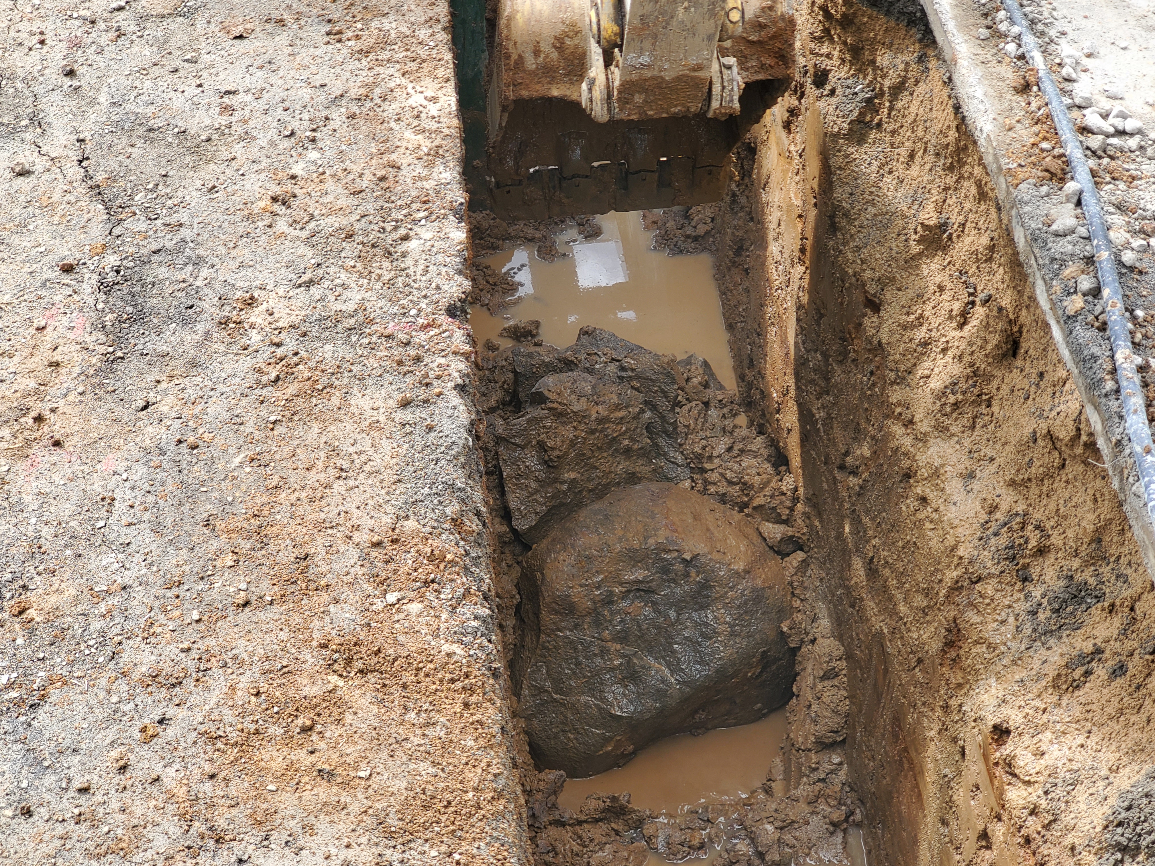 今日は天気予報は一日中『曇り』の予報でしたが・・・午前中はほぼザーザー降りでした。上も下もずぶ濡れになりながら、昨日の埋戻しの続きをしました。あんなに降ったのに『佐野土木建設さんのRC-40』は全く膿みません。むしろ『ガチガチ』に締まっていました。ハンドガイドローラーで転圧しただけなのに・・・路盤材には『サイコー!』です。転圧した後に雨水が浸透せず溜まっていました。『高けぇだけの事はある!』午後からは雨も止み、晴れ間も出て来ましたので、次スパンの掘削開始です。掘削を開始してダンプ2台搬出した所で・・・『あぁーまたまた転石!・・・もう勘弁して下さい!』一昨日に返却したばっかりなのに・・・