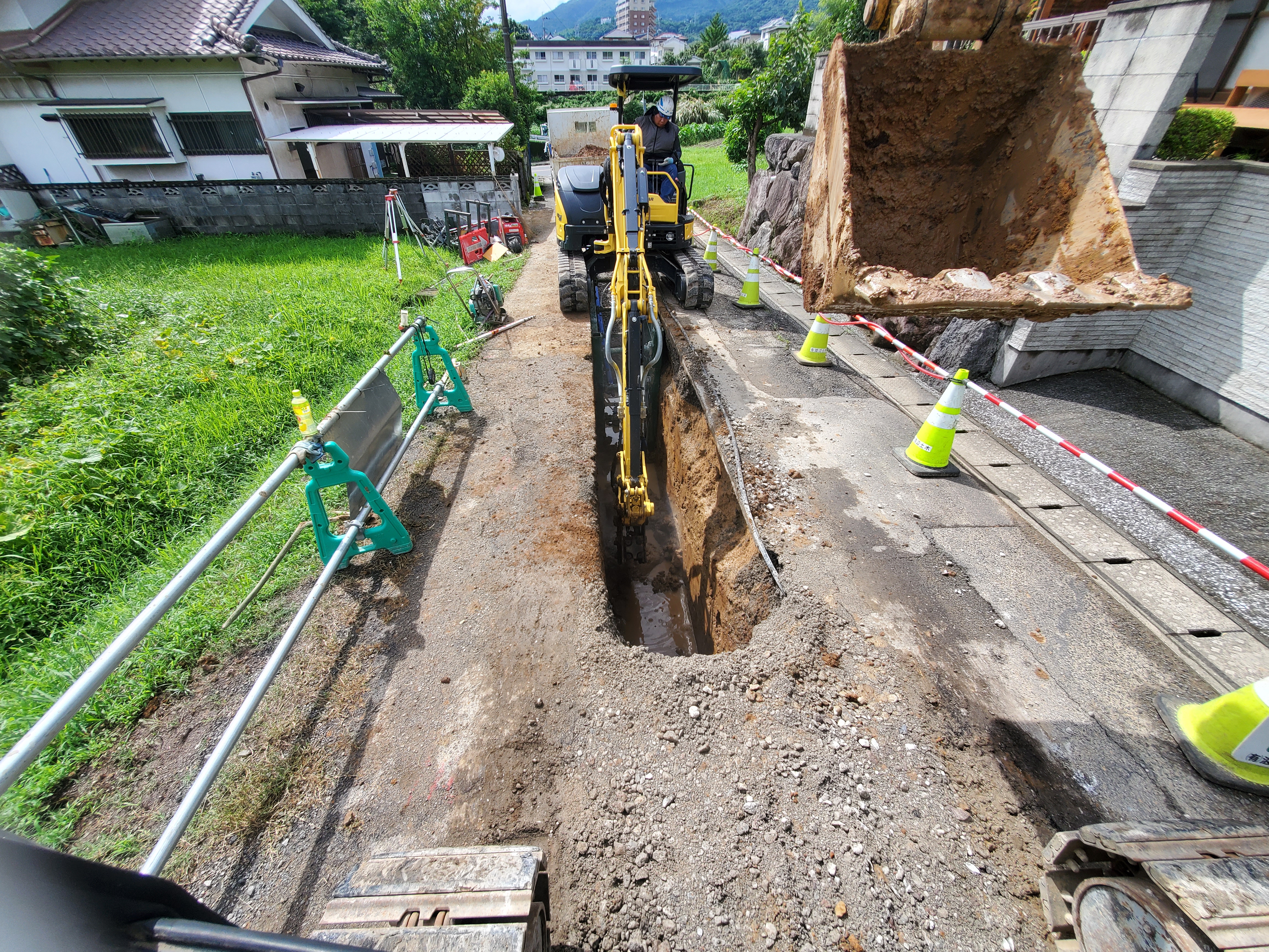 バックホウ0.3で叩けど、ピクリともしません。ブーム・アームに亀裂が入りそうです。気が付くとバケットの『爪を止める』ピンが3本無くなっていました。『もうこうなると事態は最悪です!』とりあえずNKリースさんにピンの在庫があるかTELしてトドメは『また・・・ブレーカーお願いします!』です。あぁー!また回送費にリース代がかさみます。『こん現場・・・下手したら・・・レッドカード確定?』と頭を過り、ですが、そんなこと今考えてもしょうがありません。NKリースさんにピンを取りに行った時、丁度専務が帰ってきたので、『こん前使った日から月極でお願いします!回送は払いますので・・・』と直談判し、快く?ではないでしょうが、了承していただけました。急いで現場に戻り、ブレーカーで転石を割、バケットのピンを付けて、掘削再開しました。雨天の後だからでしょうかあちこちから湧水が流入してきます。ポンプを入れたり、外したりもうバタバタしながらようやく土留2セット6mを建込ました。下水道工事の三大NGは『転石』、『湧水』、『地山の状態(ゆるい粘性土)』です。この3つが無ければ、『道路工事』などより、利益は出ます。(当社比)この現場はある意味『パーフェクト』です。今丁度半分位ですが・・・大丈夫でしょうか?残り半分もこんなんやったらアウト!かな?おまけに県道歩道部の施工箇所には『光ファイバー重要回線含めな・な・なんと11条』も埋設された所に汚水管を埋設しなければなりません。丁度掘削ラインにかかるか、掛からないか位の位置でした。(事前立会時)