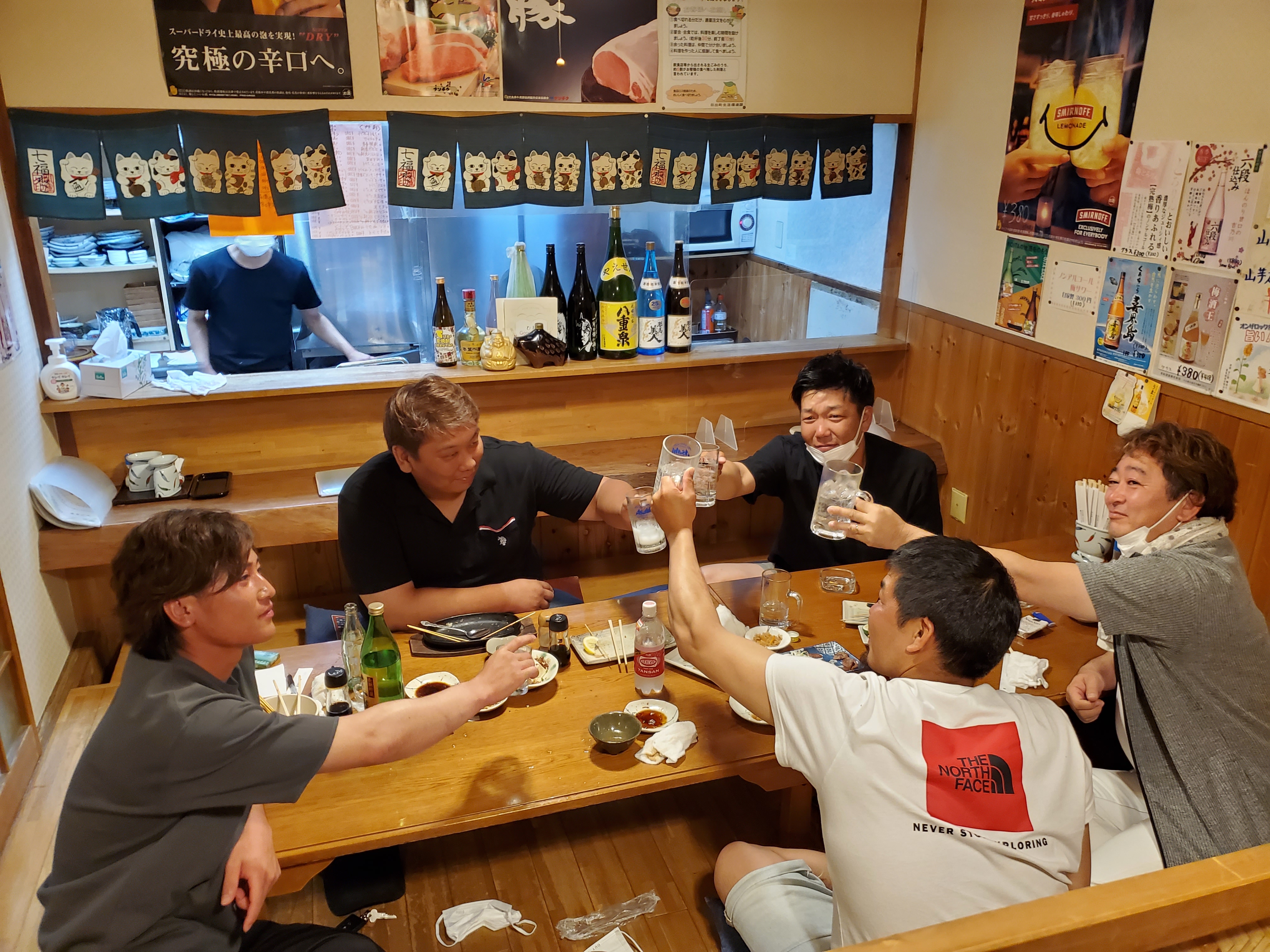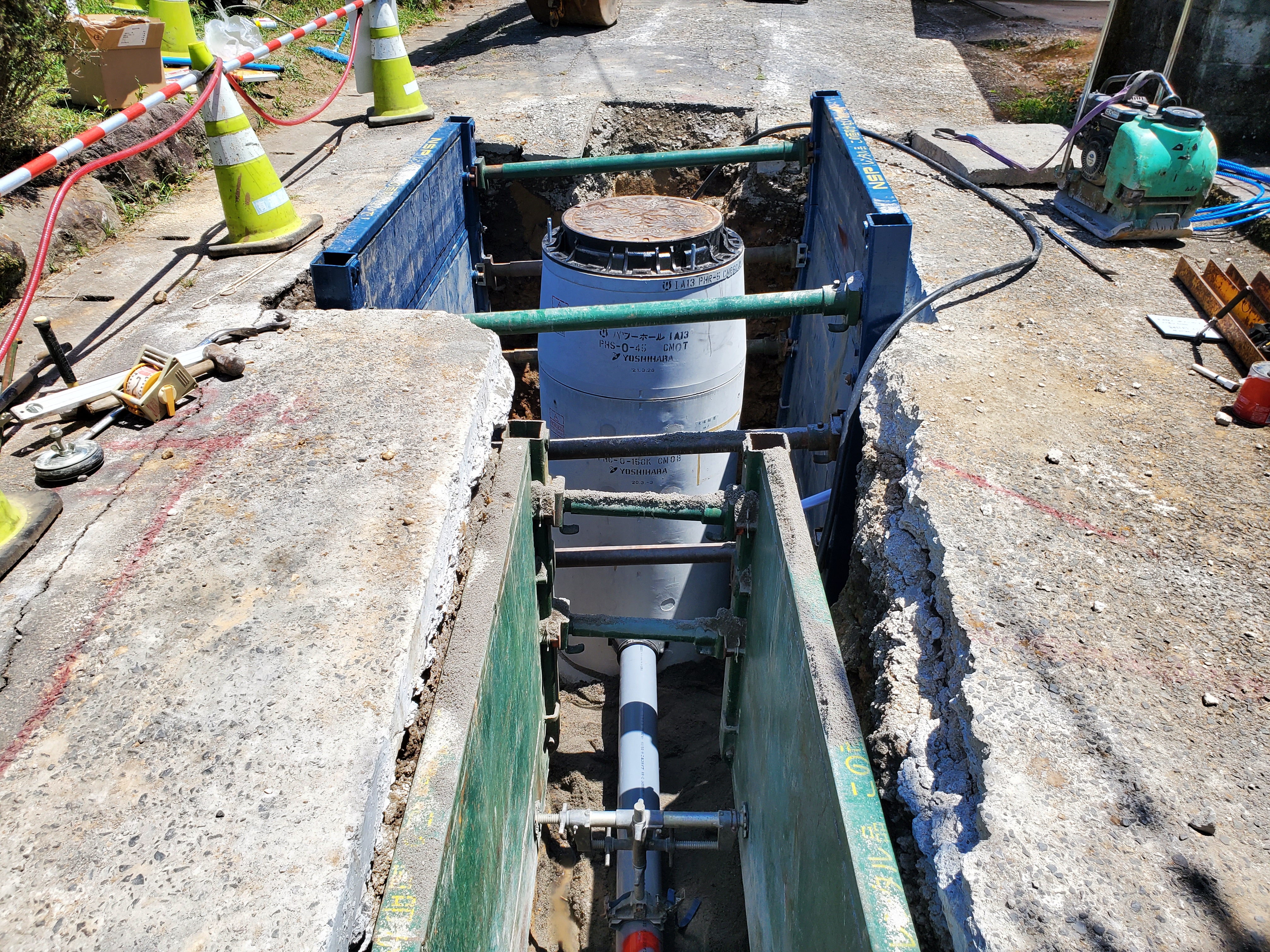 念願叶って本日より15日迄お休みです。昨日も猛烈な暑さ、時間との戦いでした。転圧していた基礎砕石に薄っすらと湧水が溜まっていました。レベルで高さを確認すると・・・10cm以上低く、これではマンホール底版を設置できません。(2,3cmくらいだったらモルタルで調整して設置しようと思いましたが・・・又一度敷いた砂をどけて砕石を投入し、プレートで転圧(四隅にスプレーで高さ出し)できちんと『下地』を作った後、砂、セメントで敷モルタル調整し底版を設置しました。底版をきちんと設置しないとどうしょうもありません。トランシットで芯を確認しながらバールで位置を微調整します。設置後、再度高さ確認、芯確認をして、設置終了しました。時間はかかりますが、後はスムーズに行きます。何とか予定通り?午前中で鉄蓋まで設置完了し、切管の接続まで完了しました。『これで今日中の埋戻し→交通解放までは終わると確信して昼ご飯にしました。皆でWピックに乗りエアコン全開にしてご飯を食べます。私は暑さで食欲がありませんでしたが、食べておかないと体力が持たないので、夏場の昼ご飯定番『お茶掛けごはん』ですすり込みました。夏場の昼ご飯はお茶漬けとお漬物で十分ですね。簡単ですし、嫁さんは喜ぶしこれぞ『一石二鳥』です。昼休憩を終え、砂埋戻し→砕石埋め戻し→土留撤去と皆でせわしく作業していきますが、マンホール回りも大量の砕石が必要で且つ、1t振動ローラーで転圧が出来ないので『タンピングランマ』で何層も転圧していかなければならないので時間は刻々と過ぎていきます。16時を回った時、ようやく埋戻しが終わりました。後は『撤去した土留部材の片付け』と『埋戻し箇所の砕砂摺り付け』です。もうみんなヘトヘト(私だけ?)ですが、何とか終業時間に『通行止め解除、交通解放』出来ました。良かったです。皆も嬉しそう?でした。今日は休み前で会社の『慰労会』をするようにしていました。コロナ渦で、夜みんなで飲食をするのは久しぶりです。仕事を頂いた大塚さんといつも協力してくれるNKリースの西村さん、うちの連中で19時から『丈ちゃん』で開催しました。15時から水分を取ってなかったので久々の『生ビール』は最高でした。皆も楽しく談笑しながら、美味しい刺身や肉をつまみにビールや焼酎が進みました。三代目、Syo君、大塚さんの翔太君は『同級生』で話も弾んでいたようです。彼らの『若い世代』がこれからの日出町建設業界を引っ張って行って欲しいといつも思っています。私たち世代はそれを支え、見守りながら(時には厳しい指導も・・・)一緒に頑張りたいと思います。念願の『超大型連休獲得』し15日までお休みです。16日から仕事は再開ですが、ゆっくり休んで、『今月中に後2スパン』終わるよう頑張ります。何か雨が強くなってきました。帰りに摺り付けが流れていないか現場を見て帰宅します。皆さん昨日はお疲れ様でした。