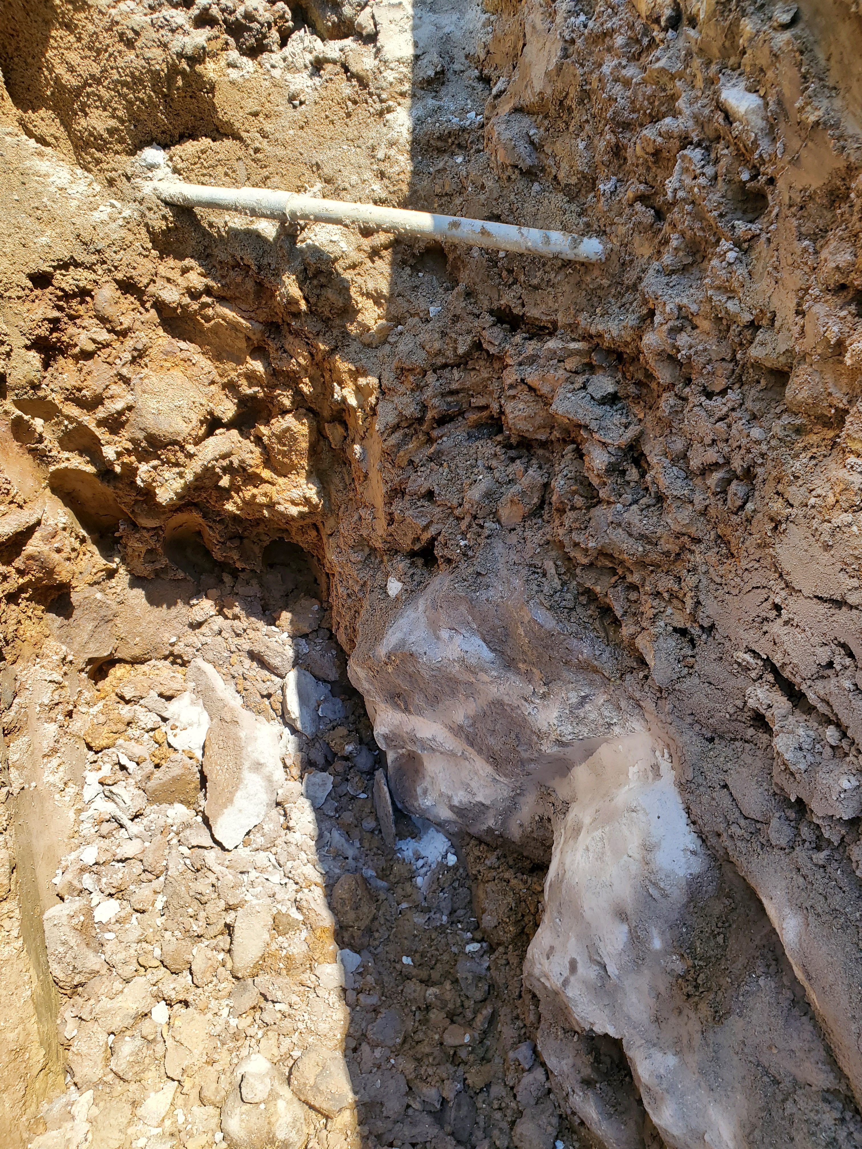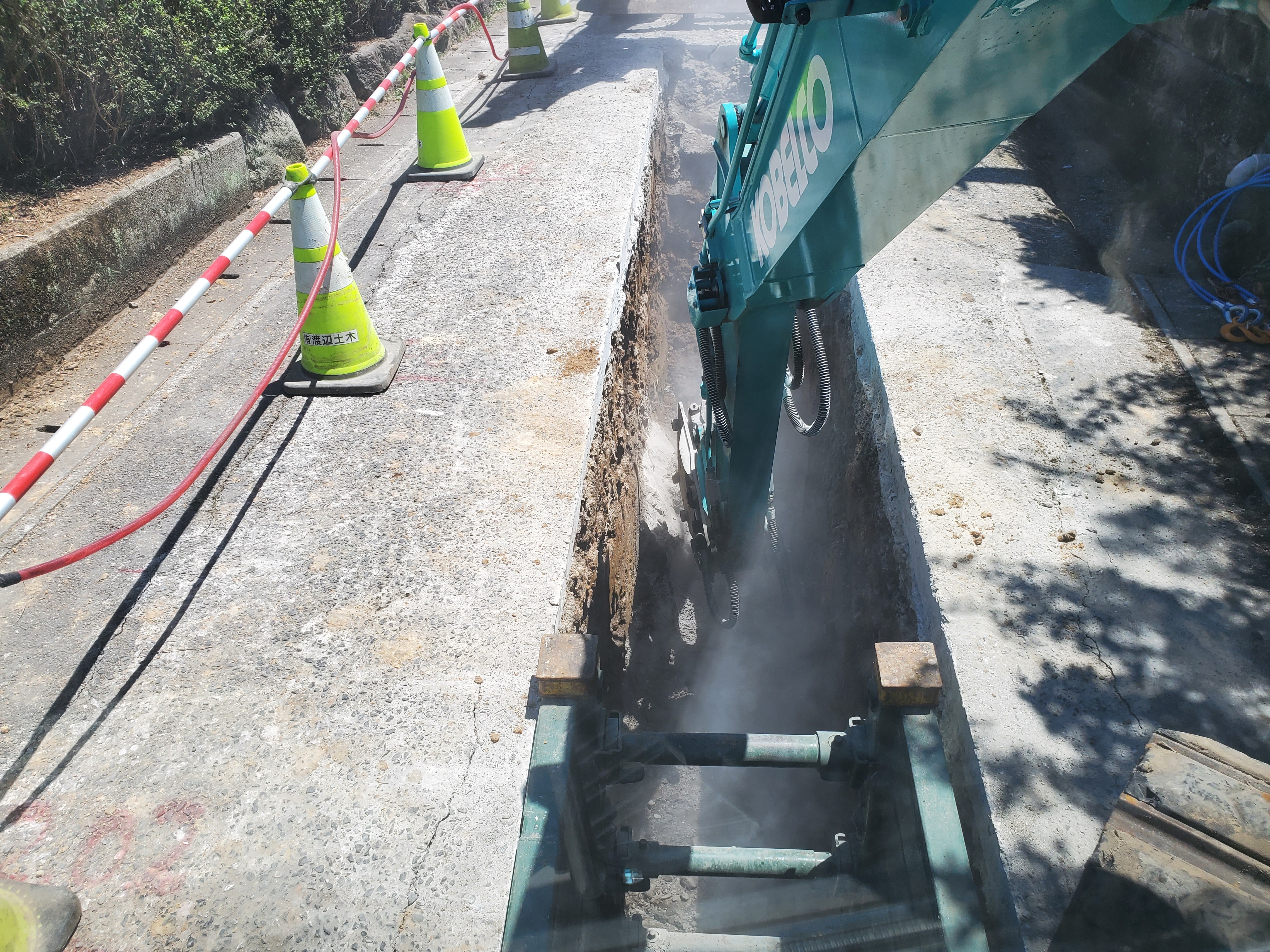 毎日書いていますが、日を追って暑さが増し、体力の限界も近づいています。それに追い打ちをかけるかの如く、第3、第4の転石が出て来ました。特に第4の転石は記載写真のとおり、水道管の真下に出ました。『何というアンラッキー』ここ迄くると、怒りを通り越して、笑いしか出ません。一昨日返却した(4tダンプの出入りに邪魔になるし、もう転石は出ないだろう、いや出ないで欲しいという想いを込めて)BH0.3ブレーカーを再度借りて破砕するのですが、水道管もあり、又転石の位置も真ん中なら良いのですが、真ん中から左右どちらかにあり、斜めに滑っているので、ブレーカーのノミが喰いつかないで煙が出るばかり、約4時間でやっとパイプが入るくらいは取れましたが、水道管の下は無理できないので、マンホールの床掘時に何とかするしかありません。今週中にマンホール迄設置、配管して、埋戻しし、『夏季休暇中は交通解放』という計画は、計画倒れになるのか?否!それは、明日の作業進行具合に大きく左右されます。今日配管2本(マンホール迄、後、切管1本)砂埋戻しまで、三代目と2人で何とか終わらせました(SYO君は2級土木施工管理技士の講習で不在)明日手際よく、砕石埋め戻しを終了し、マンホールの床掘完了、いや基礎、いや底版設置迄進めば、何とかなるのでは?と思っております。出来るだけ皆には『10日から休ませてあげたい』本当は、8月7日からの夏季休暇の予定を10日からに繰り下げしたので、尚更です!昨晩は疲れのせいか、体中に蕁麻疹が出て、夜中の3時くらいまで寝付けませんでしたので、今日は又、缶ビール1本飲んで(日頃は晩酌とか一切しません)10時には寝て、『明日の連休前最終決戦』に備えようと思います。追伸:着工当初から『ここ迄手ごわい』現場はそうないです。何か日頃の行いでも悪いのかな?